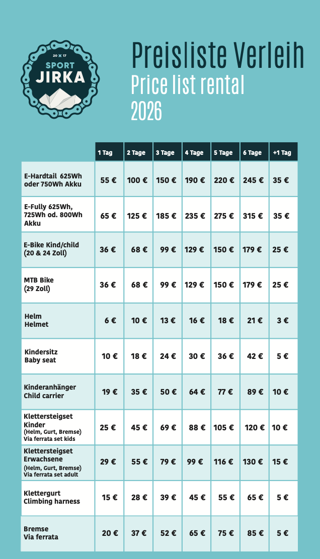 E-Bikes und Klettersteigausrüstung können leider nicht am Vortag abholt werden.